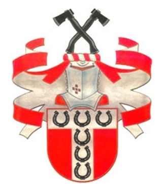 Kilpi: punaisessa kentässä hopeinen lakiopaalu, jossa kuusi mustaa ylöspäin aukeavaa hevosenkenkää, jotka asetettuna 3+1+1+1.