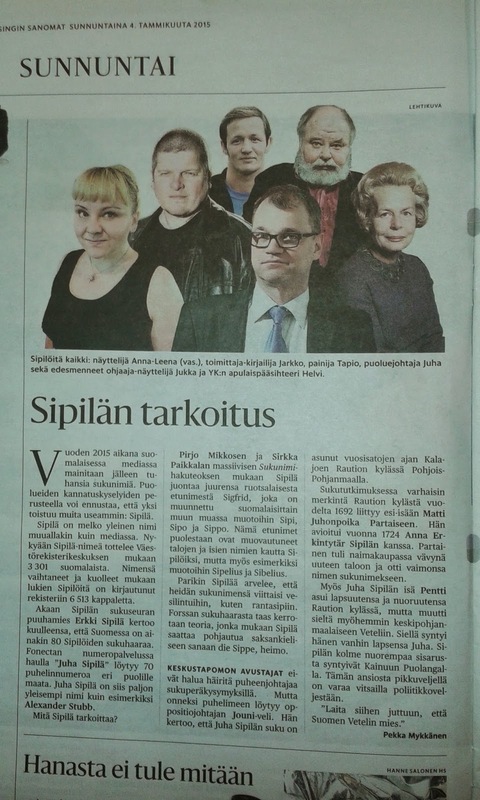 Sipilän nimen taustasta kirjoittaa Helsingin Sanomien toimittaja Pekka Mykkänen sunnuntain 4.1.2015 lehdessä. Asiantuntijakommentteja myös sukuseuramme Erkki Sipilältä. Kuvassa sukuumme kuuluva rikostoimittaja Jarkko Sipilä.