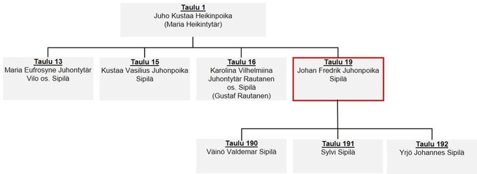 Juho Kustaa Heikinpoika (Taulu 1) tuli Sipilän eli Borgmestarin talon isännäksi jo vuonna 1862 Hän kuoli varsin norena, alle 40-vuotiaana vuonna 1875. Nuorin lapsista Johan Fredrik (Taulu 19) syntyi vasta kuukauden isänsä kuoleman jälkeen. Leski Maria (Taulu 2) hoiti taloa jonkin aikaa yksin. Vuonna 1877 hän meni uusiin naimisiin Akaassa vuonna 1845 syntyneen Jooseppi Kustaanpojan kanssa. Talon isännyys siirtyi vuonna 1894 nuorimmalle pojalle Johan Fredrikille (Taulu 19) ja sitten jo vuonna 1900 Kustaa Vasiliukselle (Taulu 15).